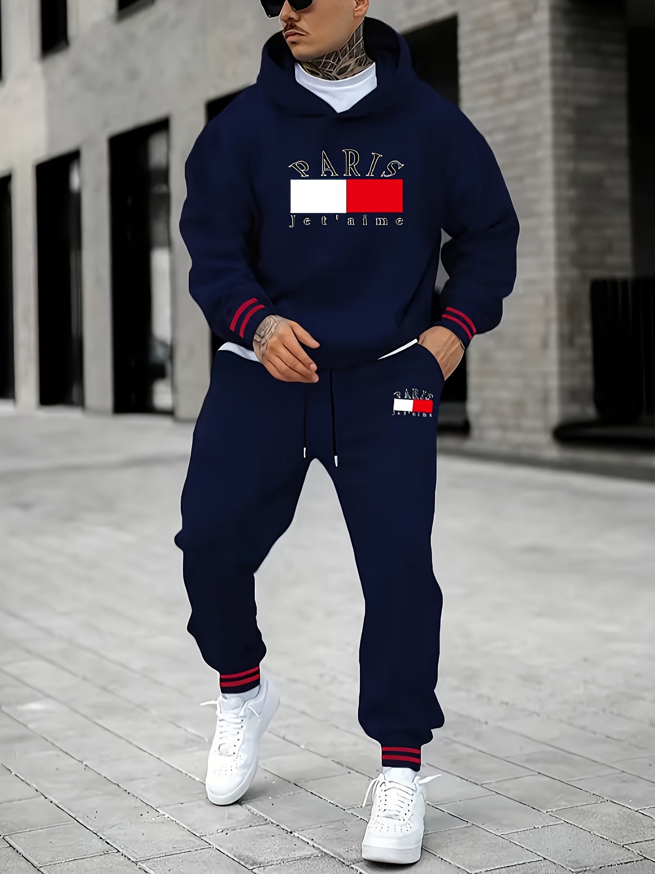 2-piece PARIS Print Men's Spring Fall Sports Outfit Set, Men's Hooded Sweatshirt With Kangaroo Pocket & Drawstring Sweatpants Set