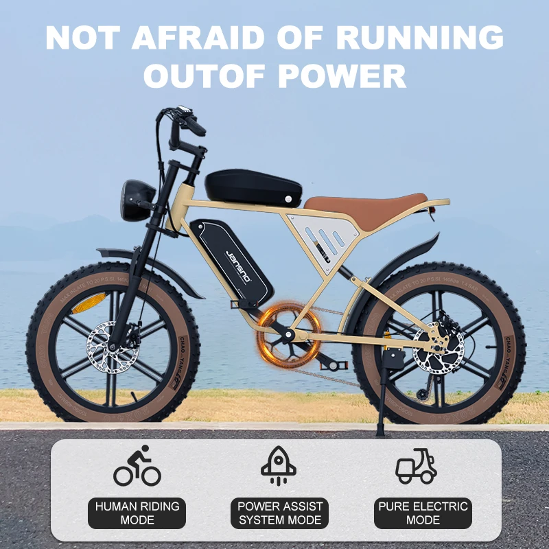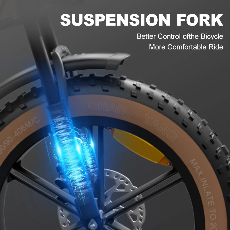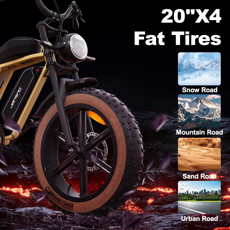 【HIGH PRECISION ENGINEERING DESIGN】— This electric bicycle frame is made of high-carbon steel, easy to climb 30 degrees — Tire: 20" * 4.0 snow tyrep; Enhanced anti-skidding and wear-resistant tires, adapt to snow, sand and other complex topography. Adapt to all terrain, snow road, sand road, gravel road. Front and rear mechanical disc brakes bring you peace of mind.