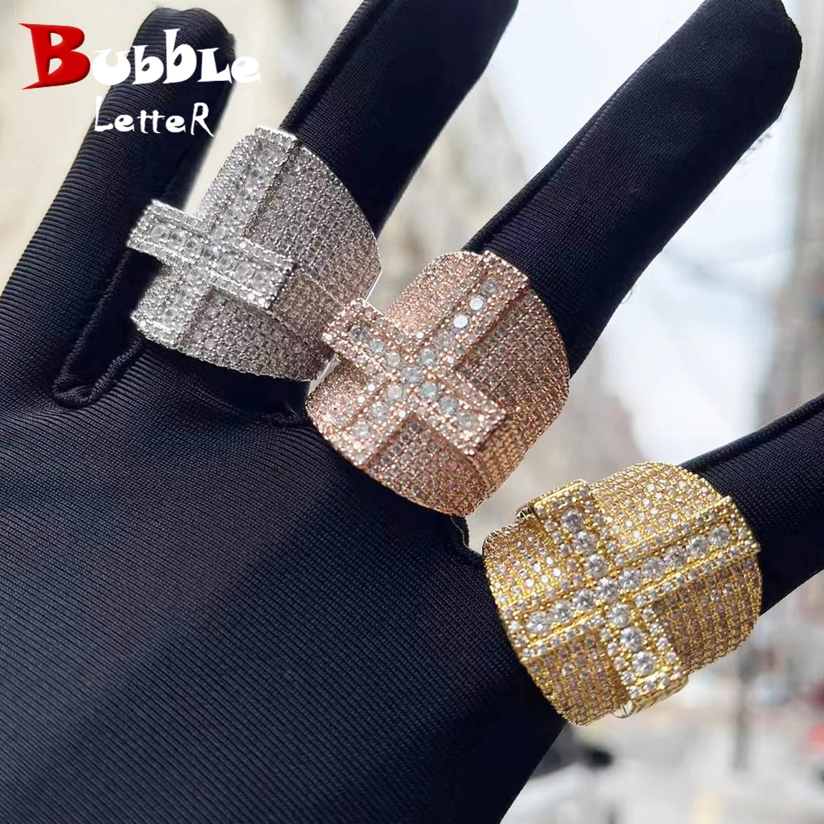 Bubble Letter Cross Ring for Men Iced Out Real Gold Plated Bling Fashion Rapper Hip Hop Jewelry 2022 Dropshipping Best Selling