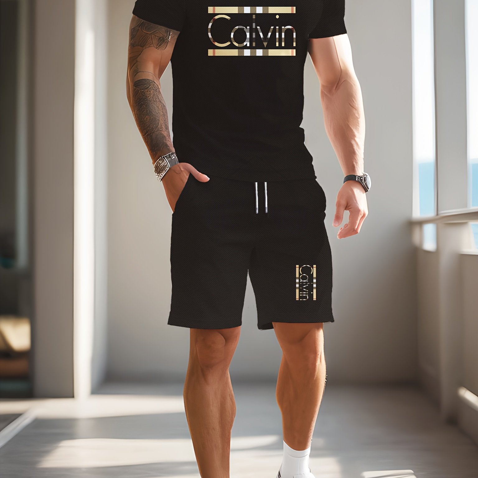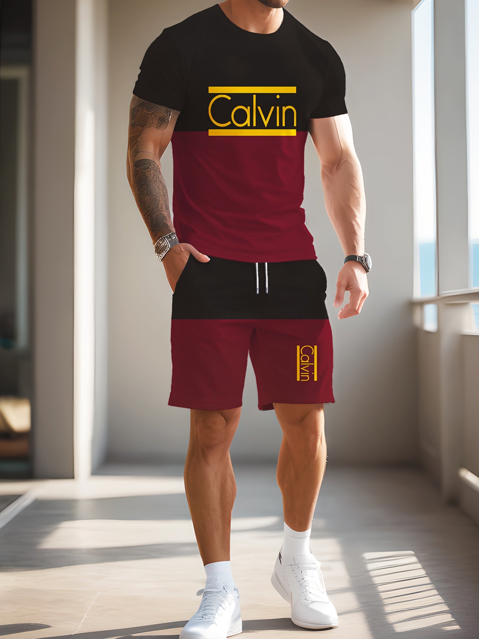 Men'S Casual Street Style 3D Quick-Dry Crew Neck Short Sleeve T-Shirt & Beach Shorts Set - Vibrant Pink with "Calvin" Letter Print, Lightweight Summer Outfit for Casual Attire, Beach Attire|Vibrant Print Tee|Lightweight Fabri