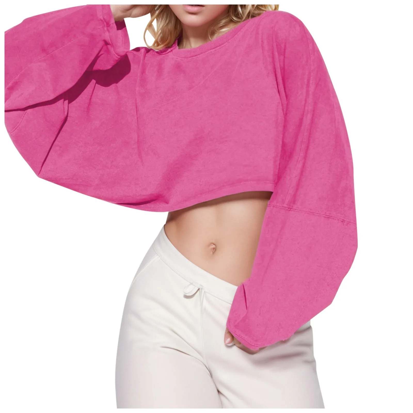 New Fashion Cropped Top Women'S Crew Neck Loose Short Sport Base T Shirt Long Sleeve Plus Size Blouse Womens Streetwear Fitted