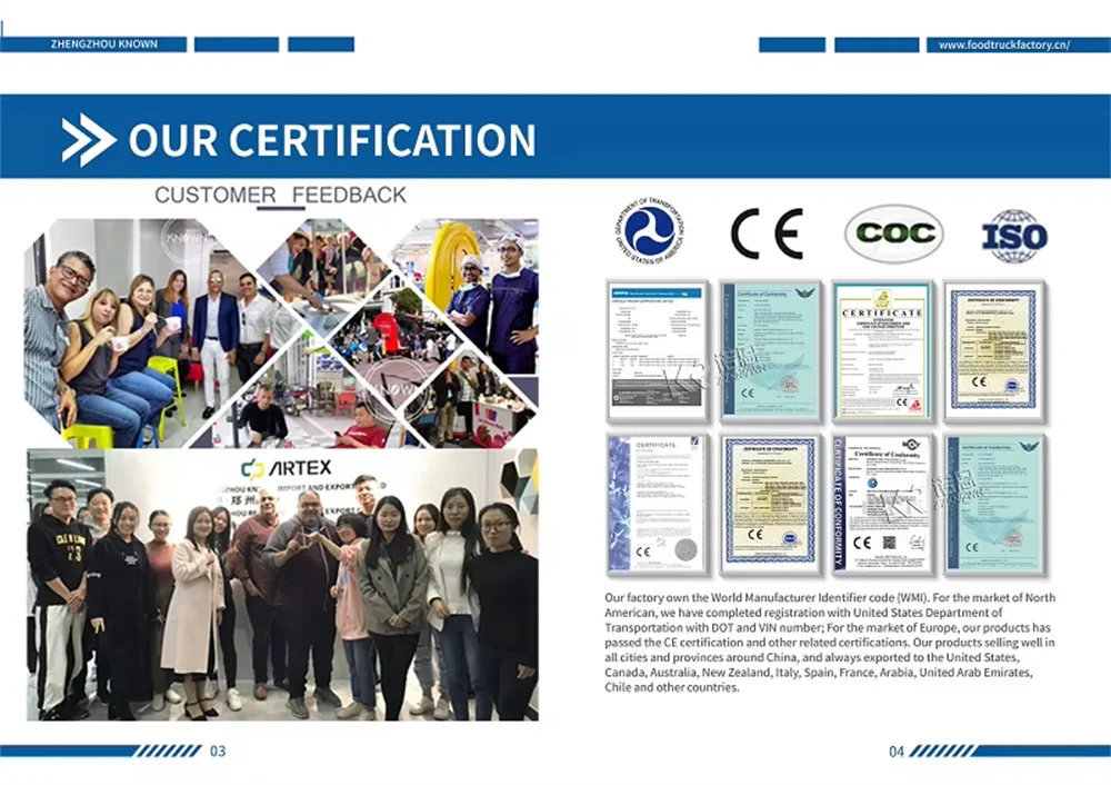 Our company specializes in producing all kinds of snack carts, hot selling mobile food trailers, well-equipped food truck equipment, hot dog carts, electric mobile food carts and other machinery. With leading technology, all of our products comply with international quality standards, are certified by CE, ISO, NSF, SGS, DOT, etc., and are appreciated worldwide.