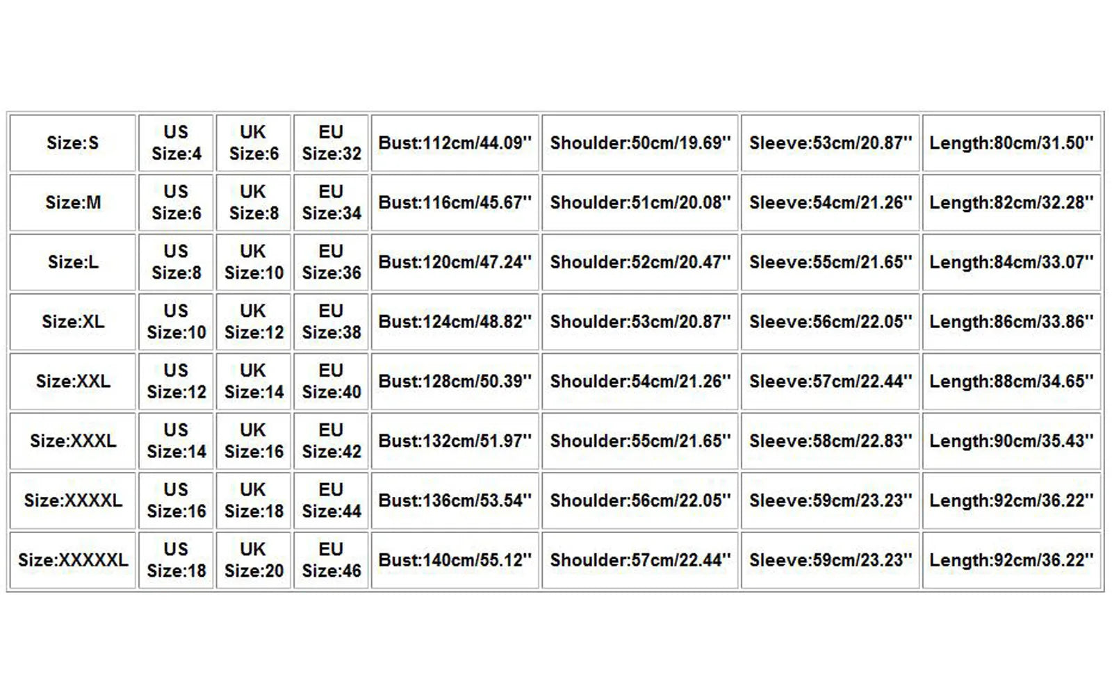 Size:XXXXL | US Size:16 | UK Size:18 | EU Size:44 | Bust:136cm/53.54'' | Shoulder:56cm/22.05'' | Sleeve:59cm/23.23'' | Length:92cm/36.22'' |