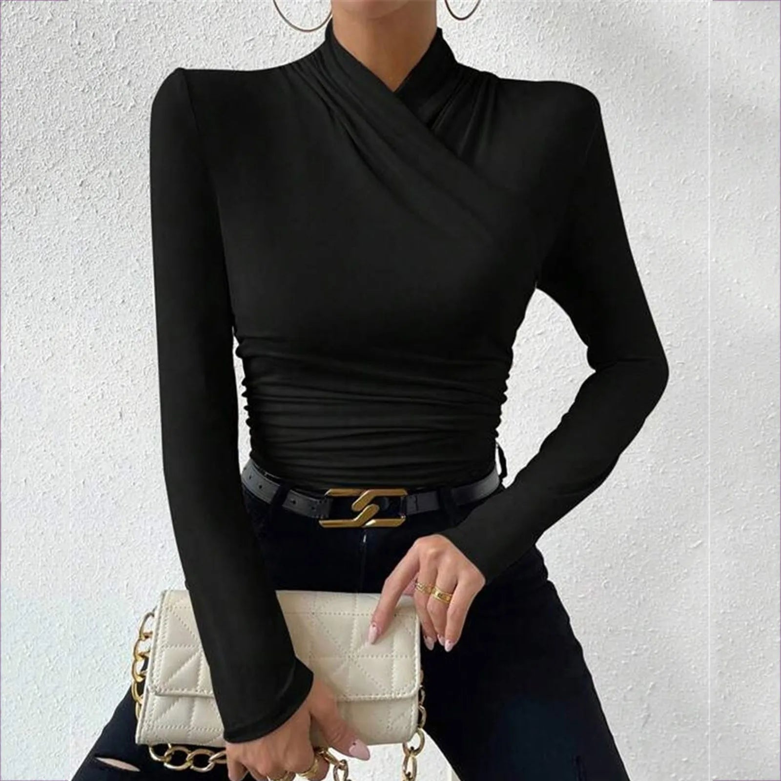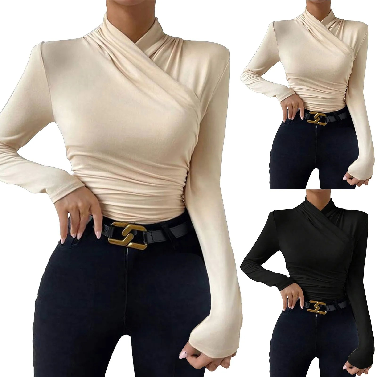 Women's Autumn And Winter With A Neckline Slim Fit And Versatile Pleated T Shirt