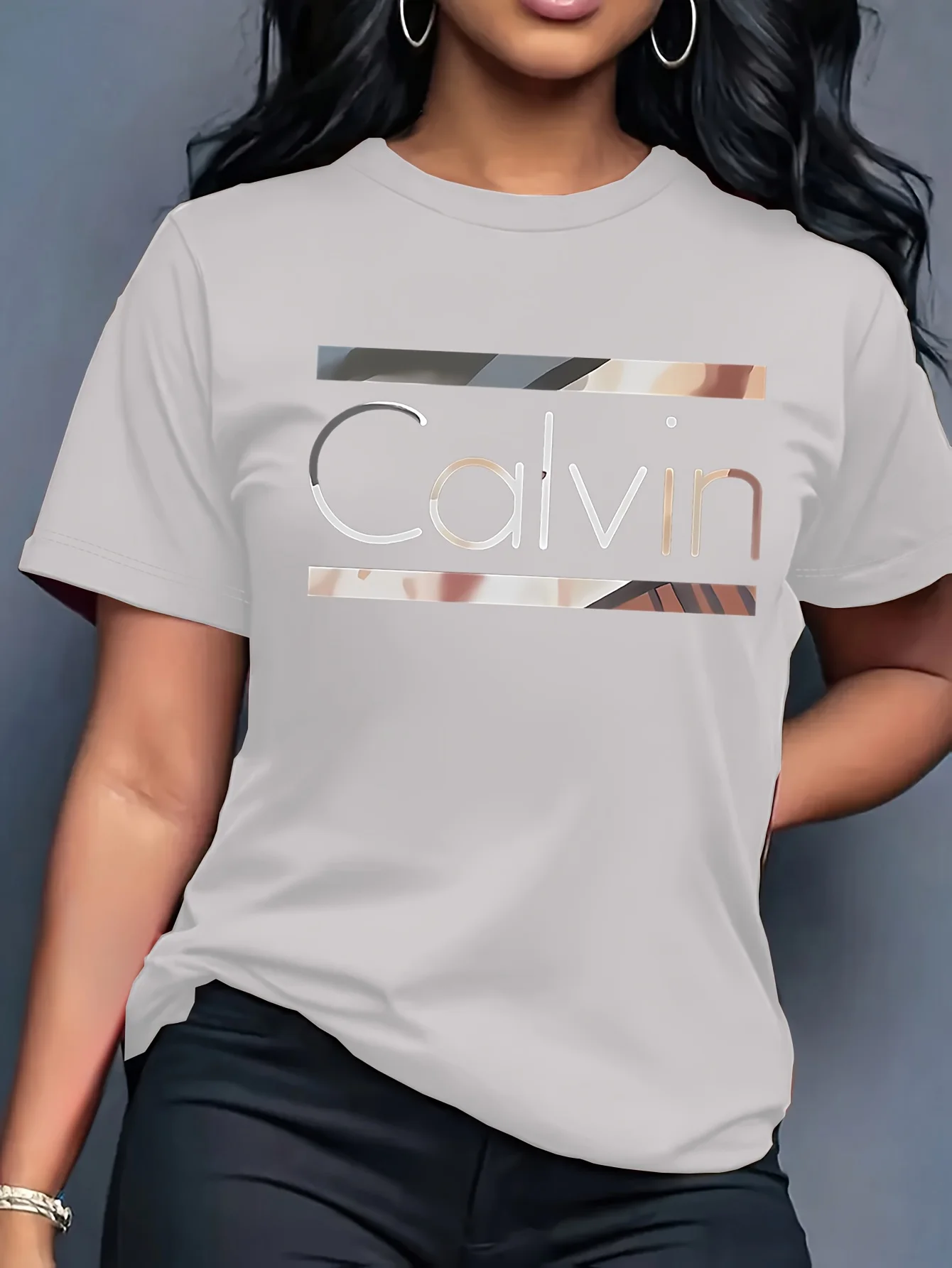 Women's Summer 100% Cotton Fashion Casual Calvin Letter Pattern Printed Loose Round Neck Short Sleeve T-shirt Top